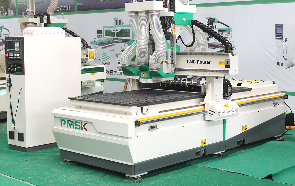 1機(jī)器接通電源,加工臺(tái)面上上放好藍(lán)色刨花板。
