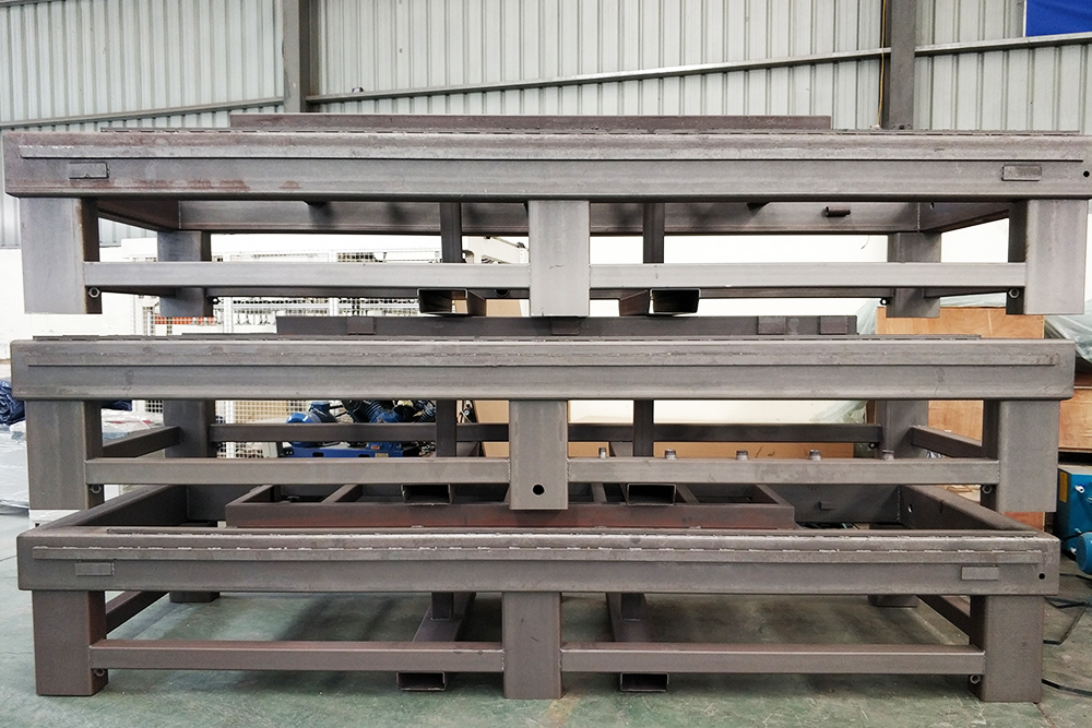 數(shù)控開料機床身全部都是采用整體的8MM的整體鋼板焊接,焊接完成后經(jīng)過打磨,以及后期的回火和噴砂處理。再由公司斥巨資引進的大型五面銑設備進行齒條安裝面、導軌安裝面及定位裝置安裝面的加工,這樣大大保證了機器裝配精度,提供機器的加工精度和使用壽命。 反之一些小廠家沒有專業(yè)的設備來進行床身的加工,只能胡亂吹噓,對客戶說的天花亂墜,但是沒有實質(zhì)性的證明。