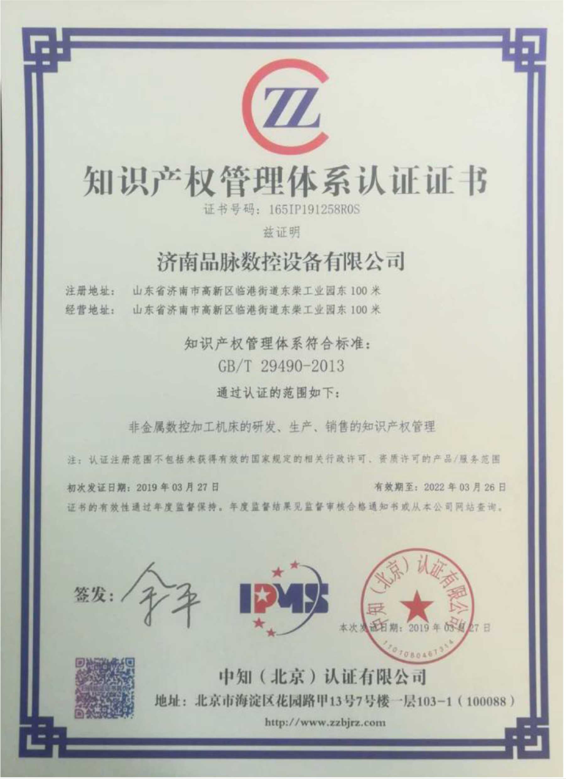 品脈數(shù)控榮獲知識產權管理體系認證證書