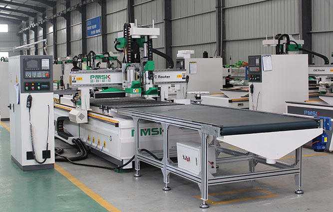 木工加工中心加排鉆是在標準加工中心加排鉆開料機的基礎上增加自動上下料功能,給機器加裝了一套能夠自動抓料的兩個手臂、一個上料放板平臺和自動傳送下料平臺。機器在加工過程中實現(xiàn)自動化加工,為家具廠生產(chǎn)降低了人工勞動強度,提高產(chǎn)量。