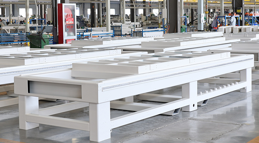 重型床身結(jié)構(gòu),經(jīng)退火,拋丸處理,龍門(mén)銑加工,設(shè)備精度高,壽命長(zhǎng)。